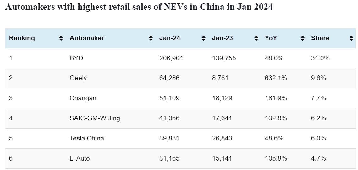 Data table: China NEV sales in Jan 1-31