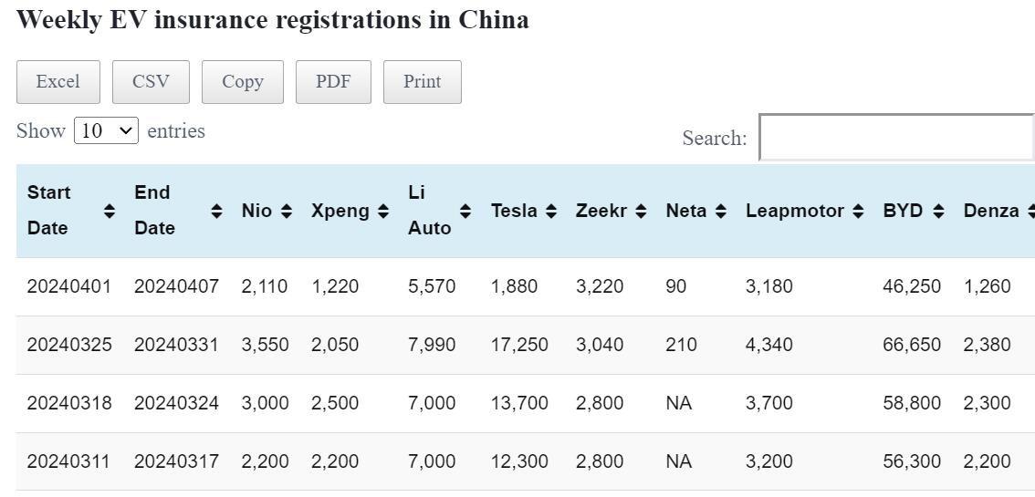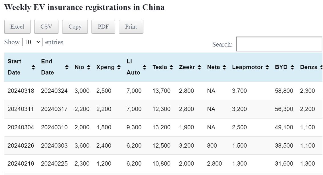 Data table: China EV insurance registrations in Mar 25-31