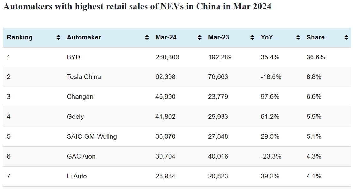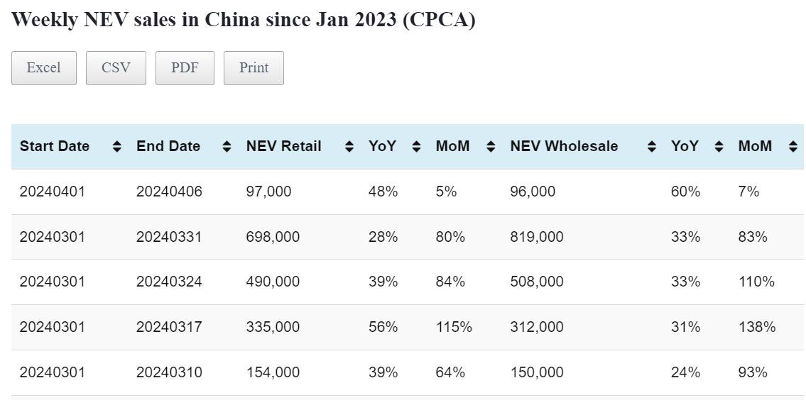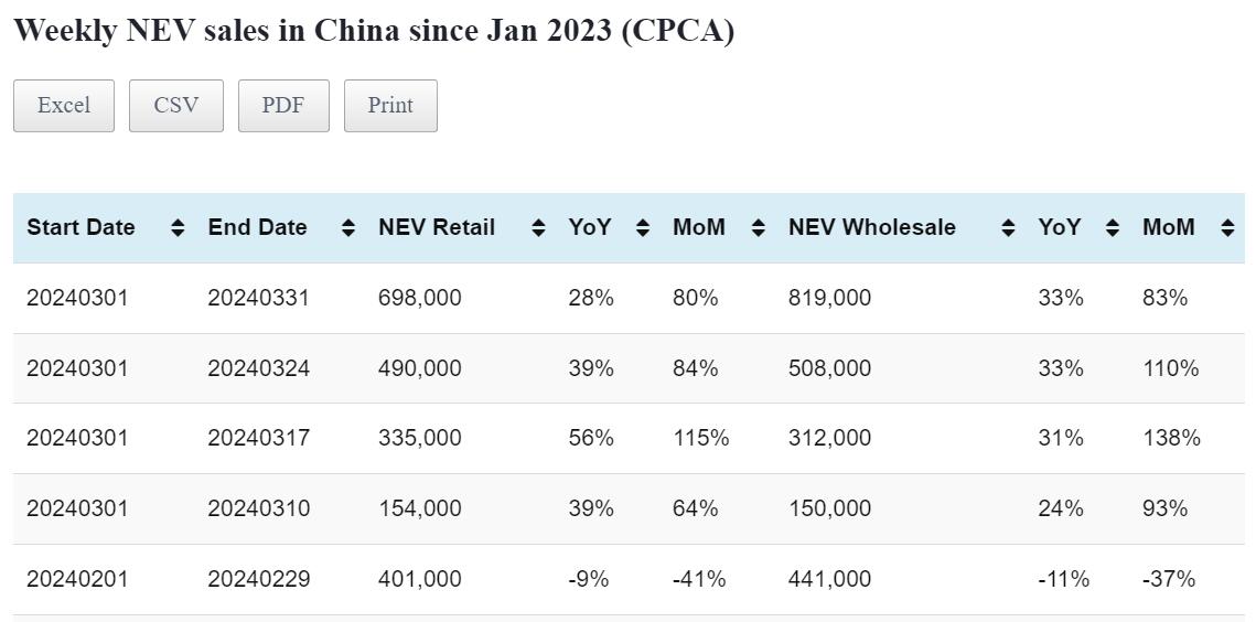 Data table: China NEV sales in Mar 1-31