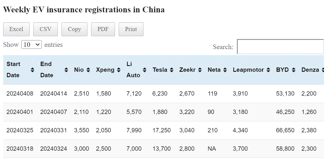 Data table: China EV insurance registrations in Apr 8-14