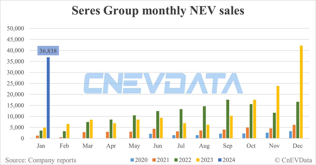 Seres Group reported sales of 36,838 NEVs in January, including 31,017 units under the Seres brand.