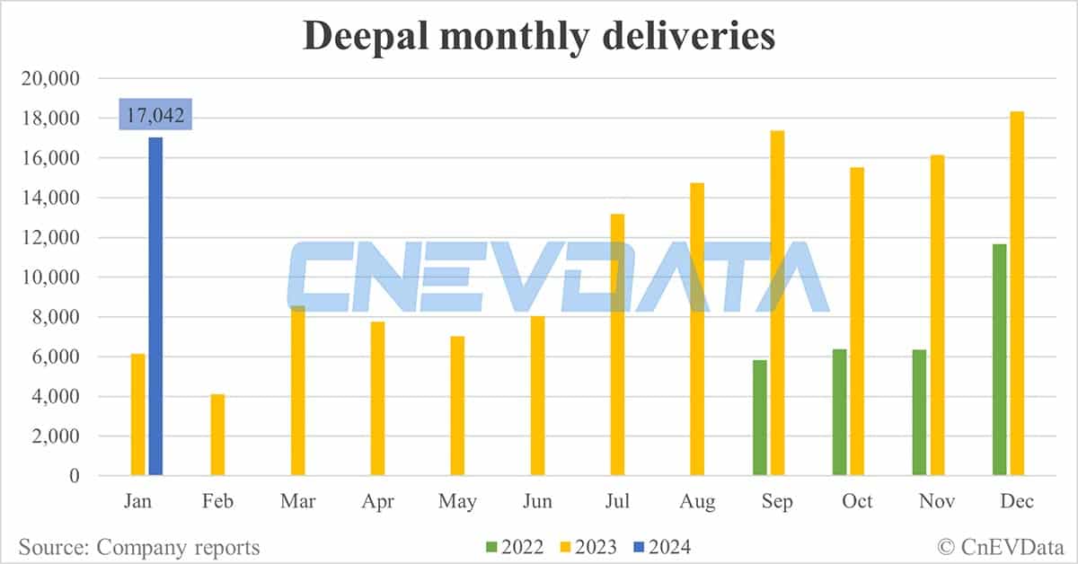 Deepal's deliveries in January were up 177.69 percent year-on-year, but down 7.07 percent from December.