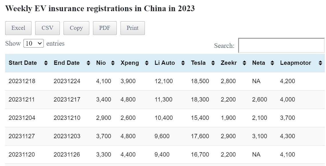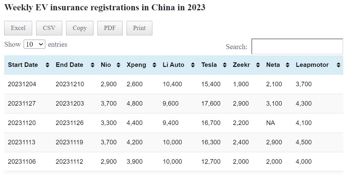 Weekly insurance registrations for vehicles of Nio, Xpeng, Li Auto, Tesla, Zeekr, Neta, and Leapmotor are included in this article.