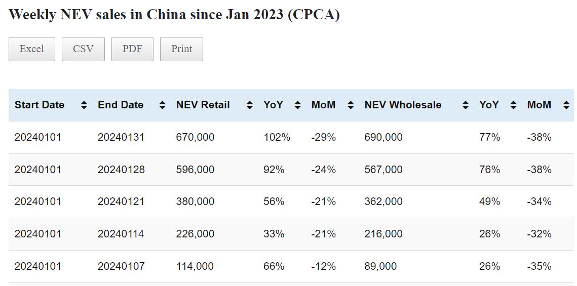 Data table: China NEV sales in Jan 1-31