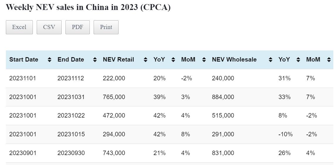 Data table: China NEV sales in Nov 1-12