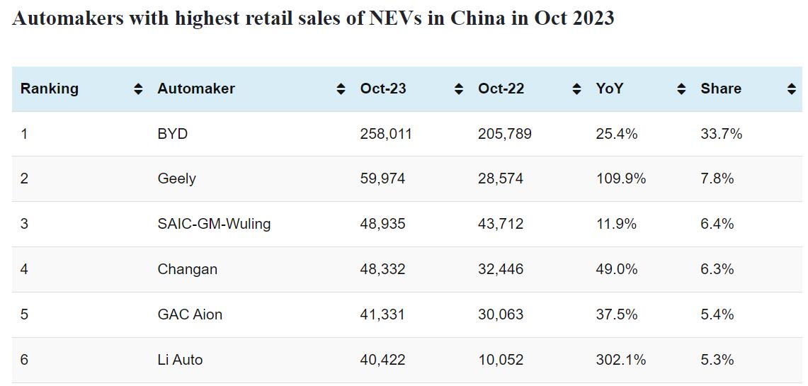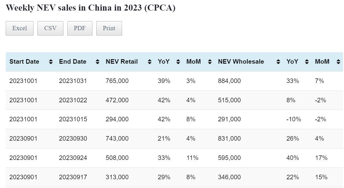 Data table: China NEV sales in Oct 1-31