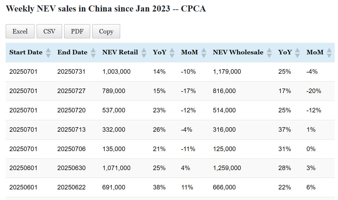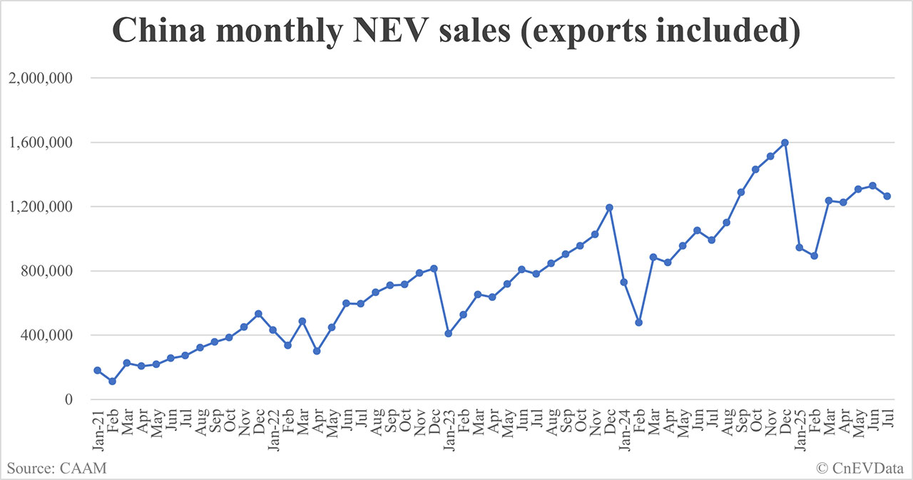 From July 1 to 31, China's passenger NEV retail sales totaled 1.003 million units, up 14 percent year-on-year, but down 10 percent from June.