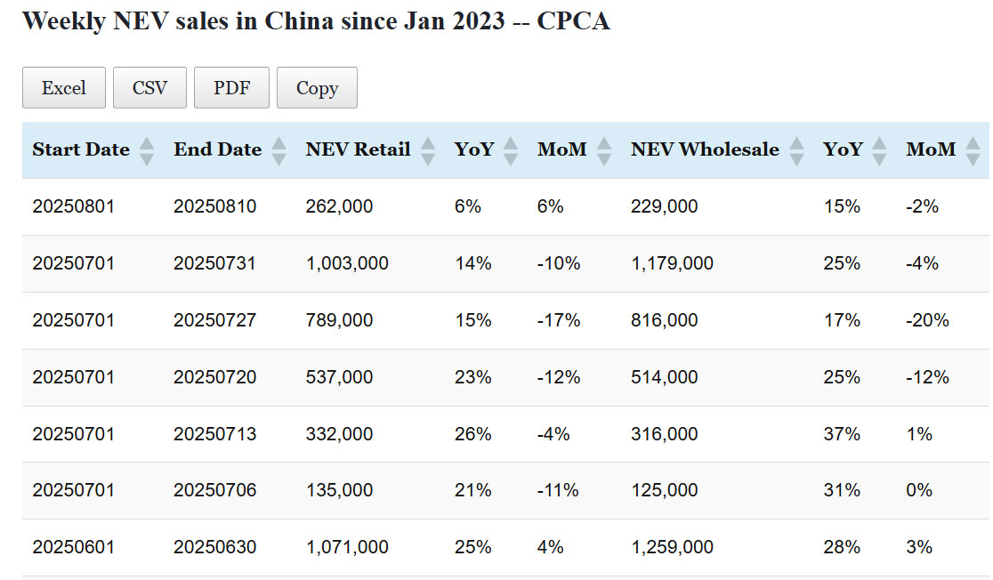 From August 1 to 10, China's passenger NEV retail sales totaled 262,000 units, up 6 percent both year-on-year and month-on-month.