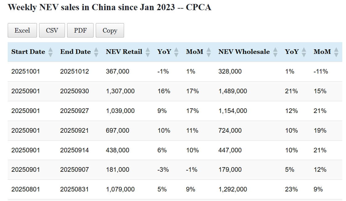 Data table: China NEV sales in Oct 1-12
