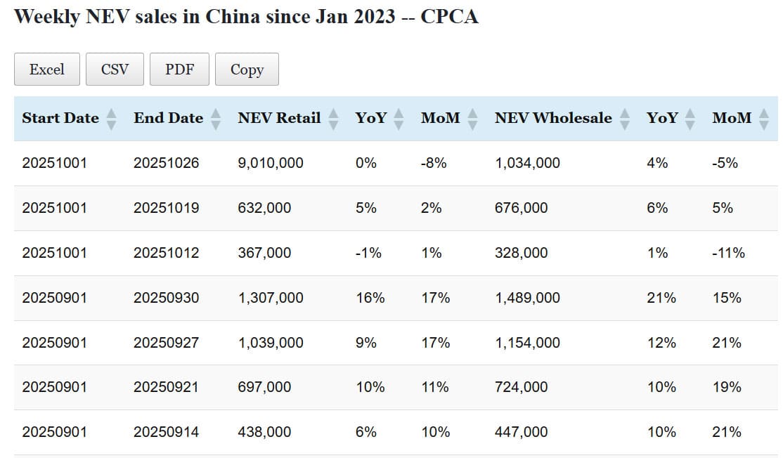 Data table: China NEV sales in Oct 1-26