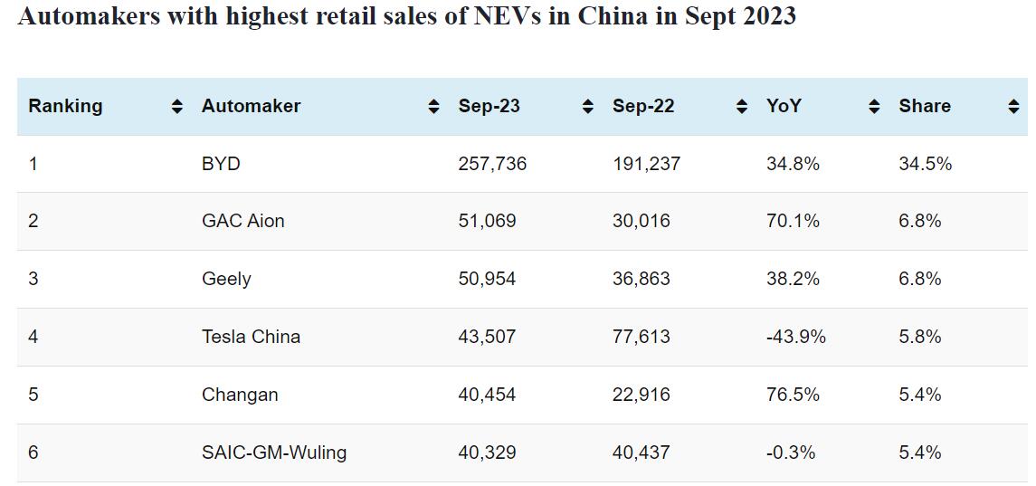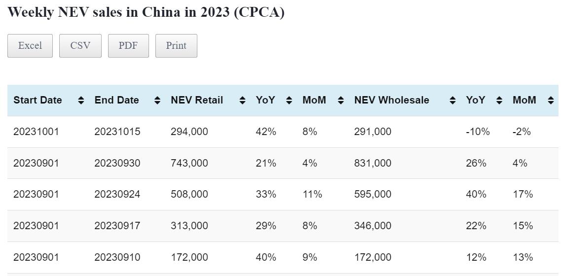 Data table: China NEV sales in Oct 1-15