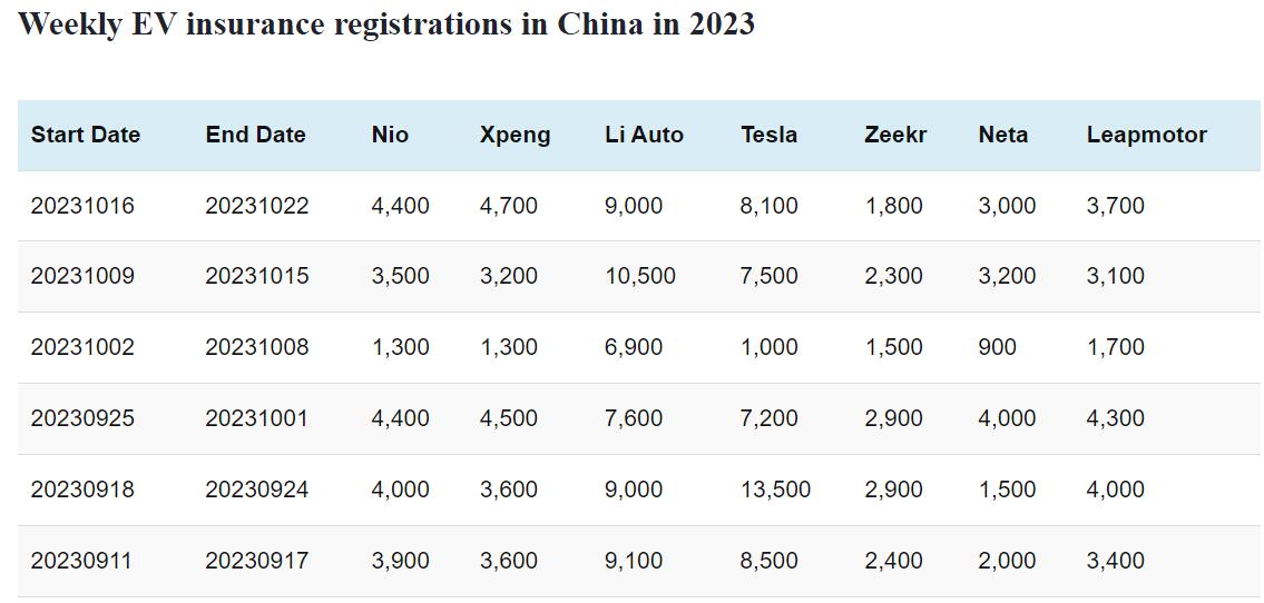 Weekly insurance registrations for vehicles of NIO, XPeng, Li Auto, Tesla, Zeekr, Neta, and Leapmotor are included in this article.