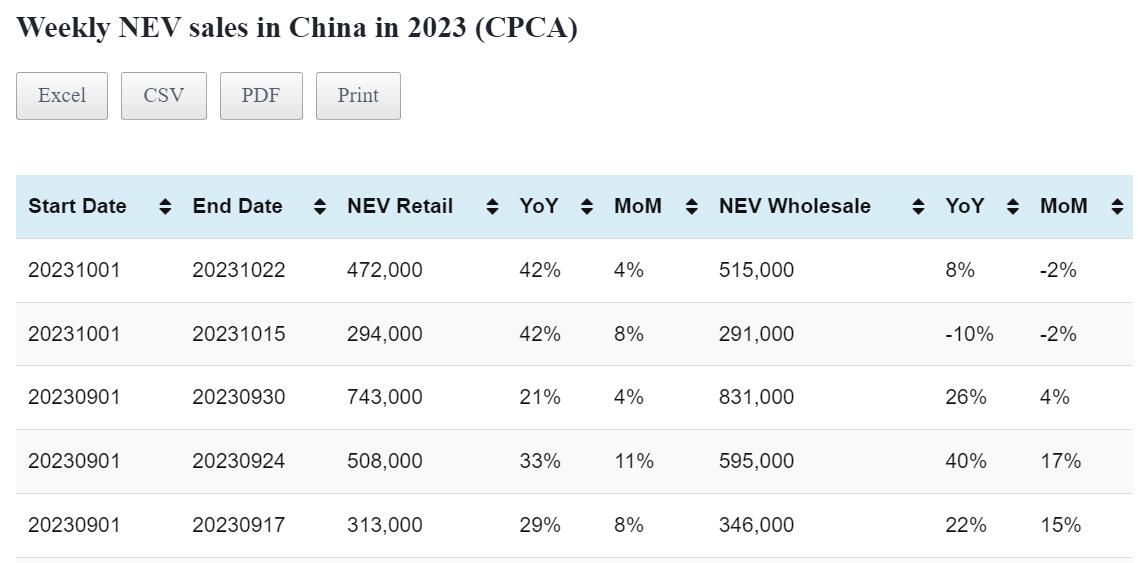 Data table: China NEV sales in Oct 1-22