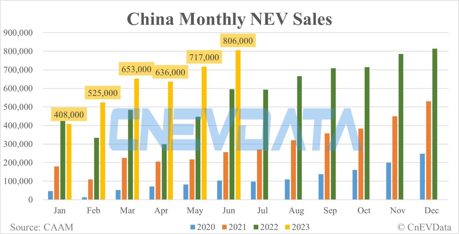 China NEV sales at 806,000 in Jun, CAAM data show