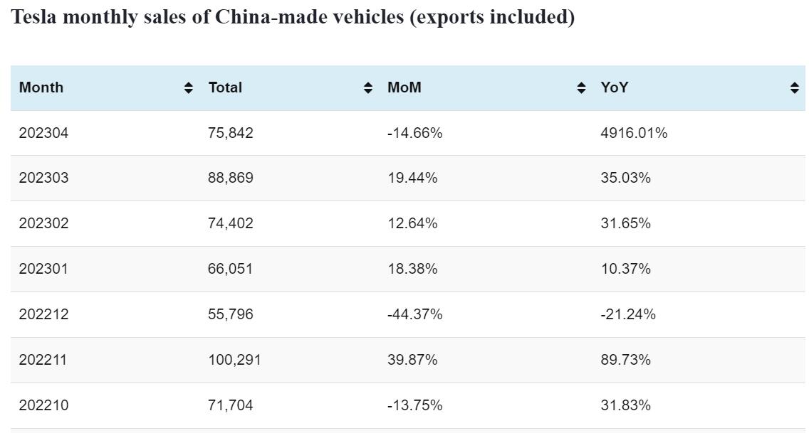 Tesla's China-made vehicle sales in Apr: 75,842