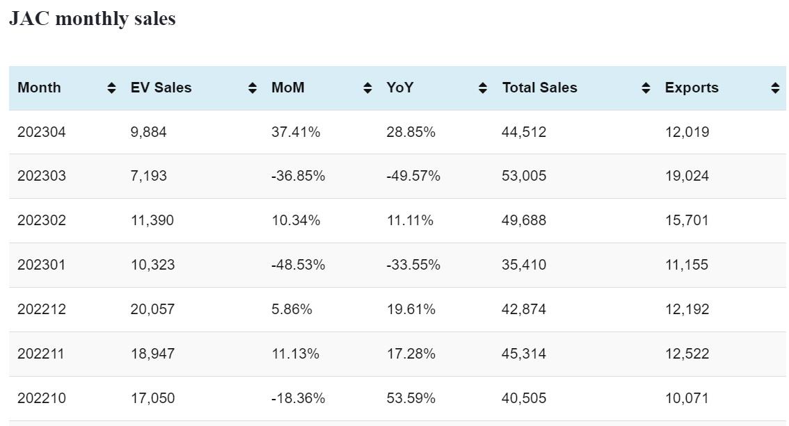 JAC EV sales in Apr: 9,884