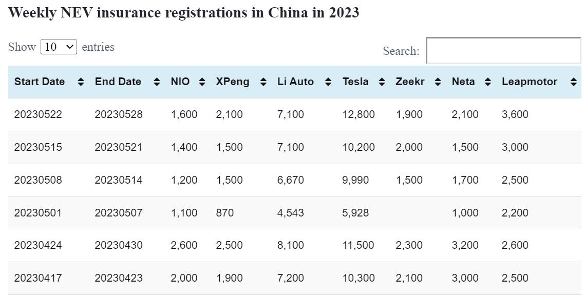 Data table: China NEV weekly insurance registrations