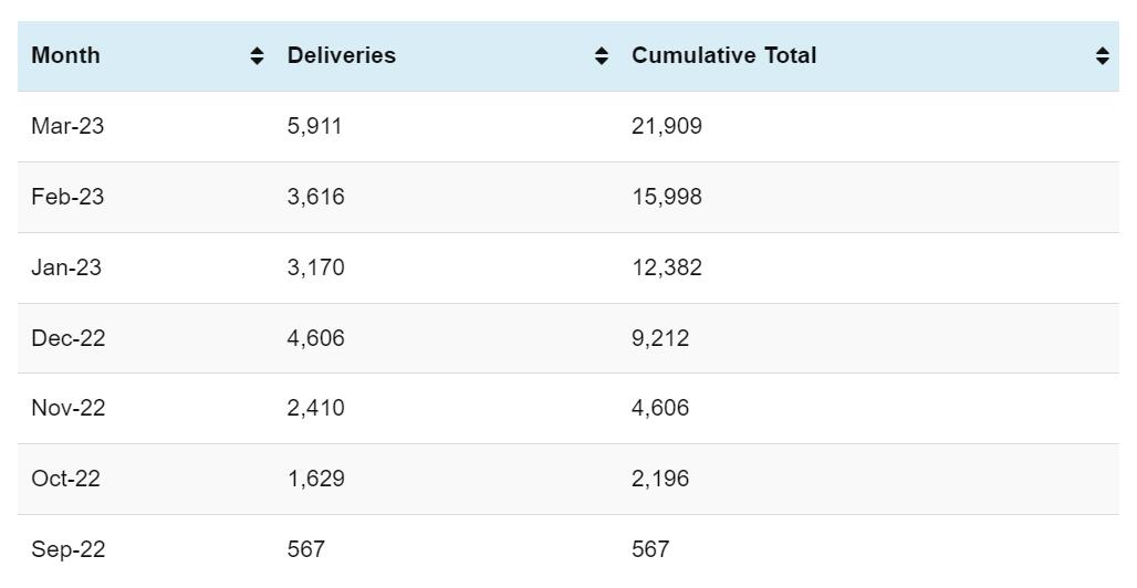 Cumulative Smart deliveries since deliveries began in September 2022 are 21,909 units.