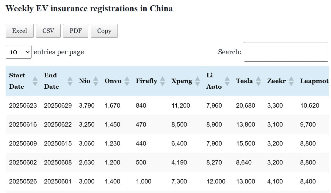 Data table: China EV insurance registrations in Jun 23-29
