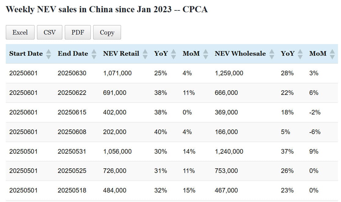 Data table: China NEV sales in Jun 1-30