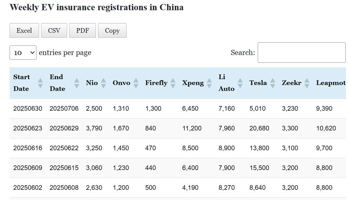 Data table: China EV insurance registrations in Jun 30-Jul 6