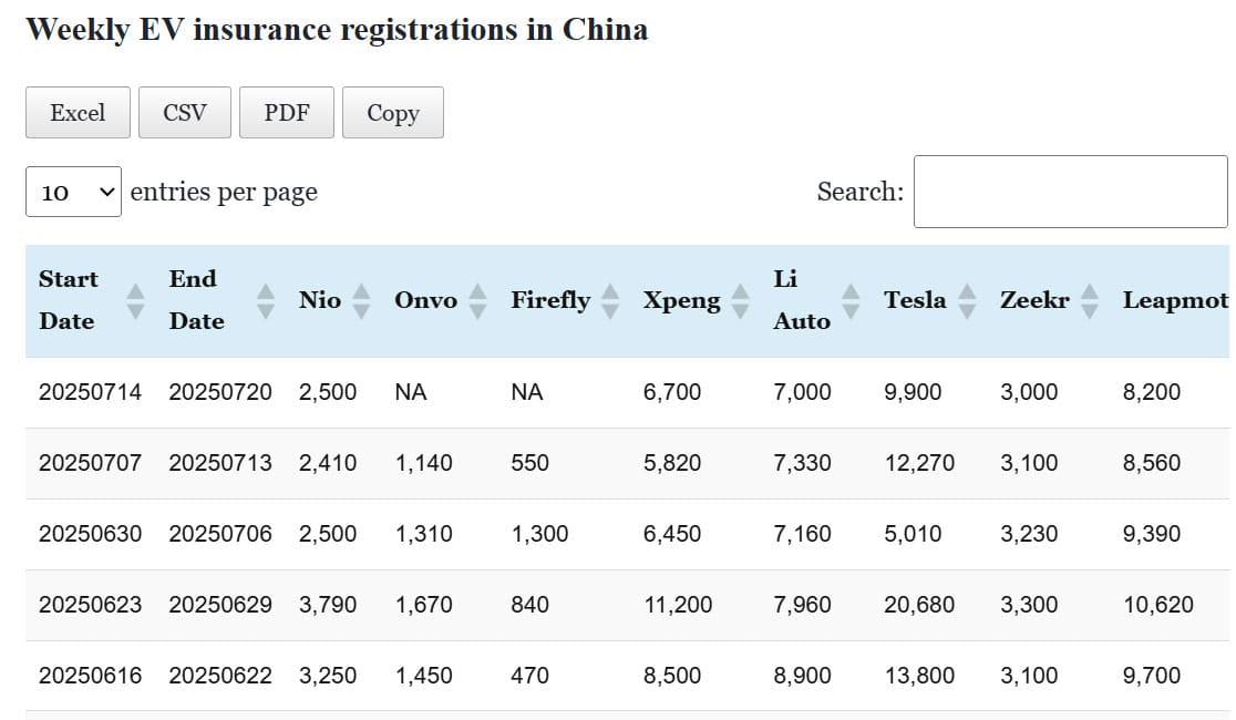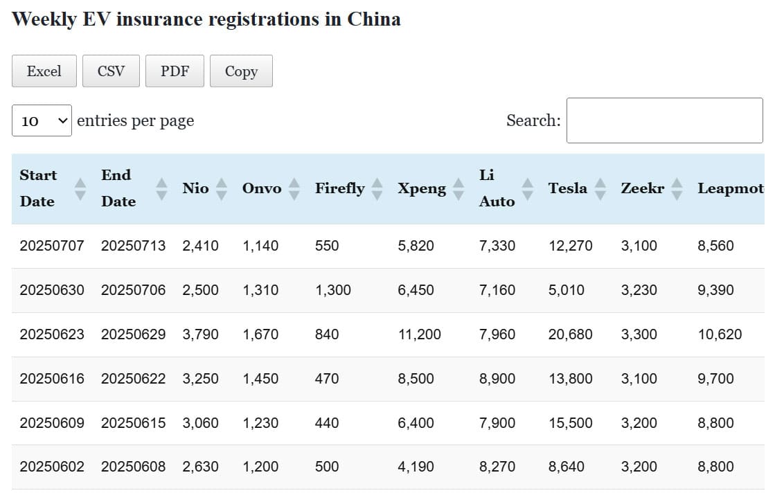 Data table: China EV insurance registrations in Jul 7-13