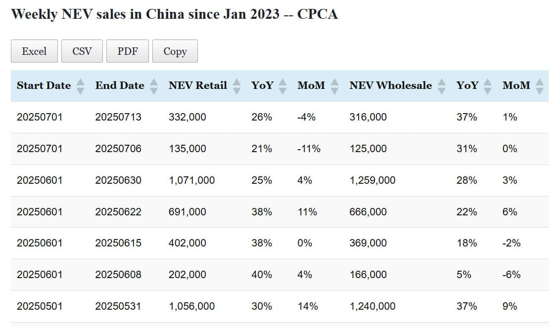 Data table: China NEV sales in Jul 1-13