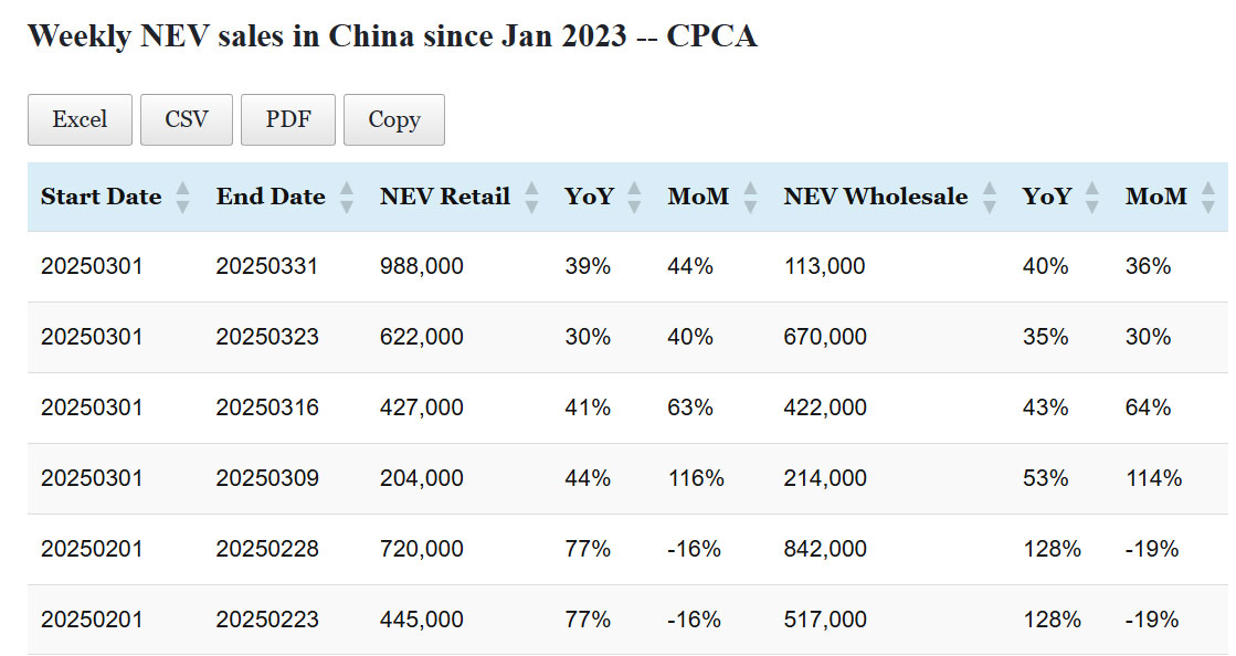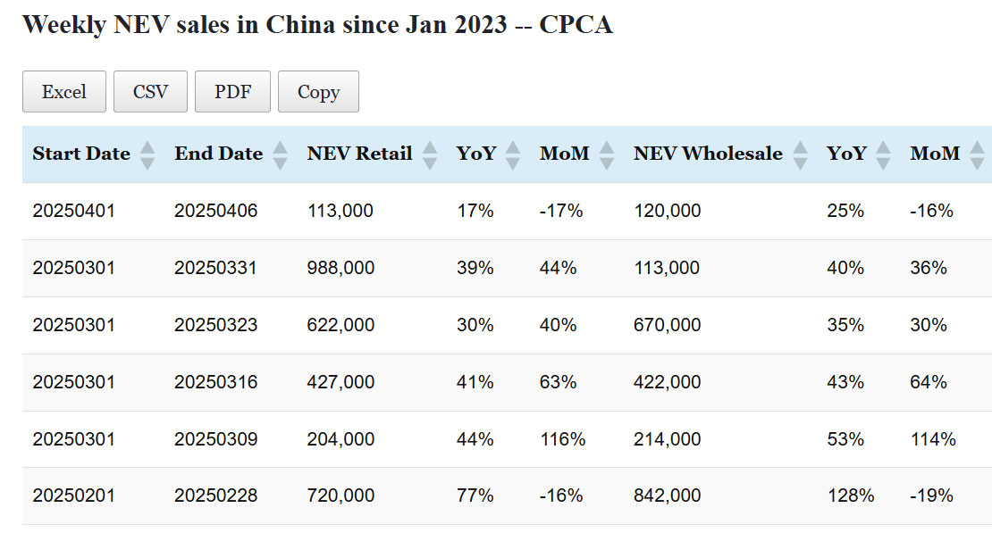 This article contains details and tables of China's monthly NEV sales data released by CAAM.