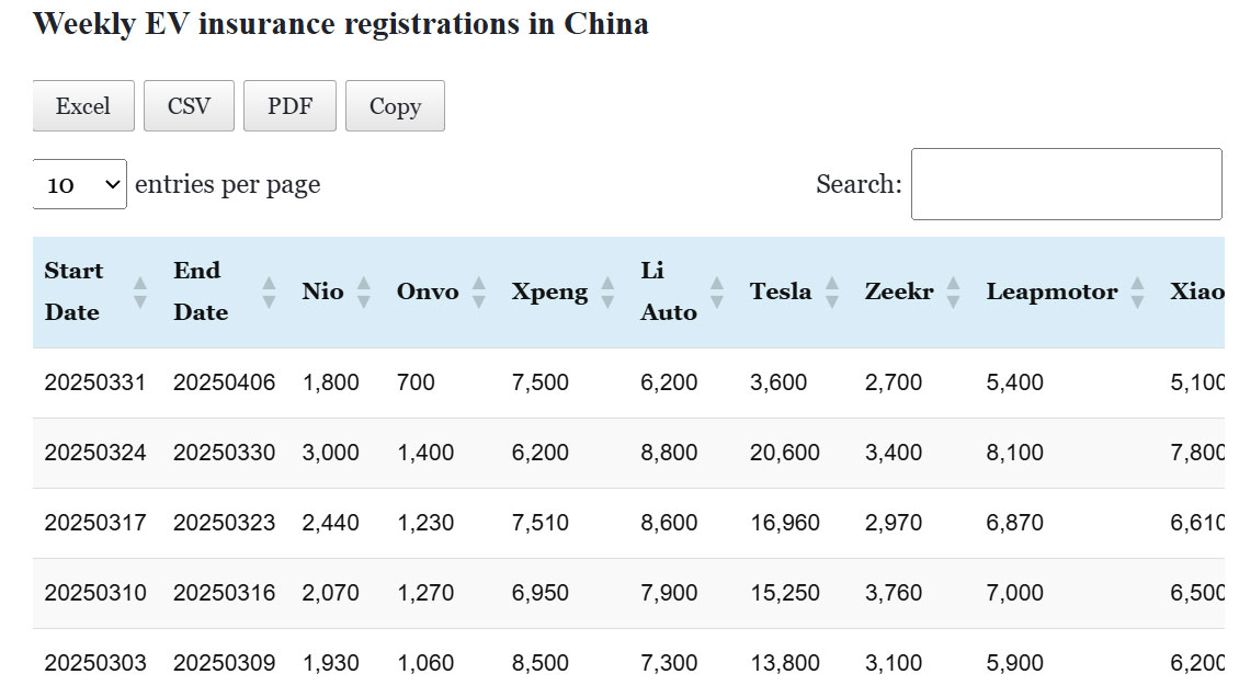 Data table: China EV insurance registrations in Mar 31-Apr 6