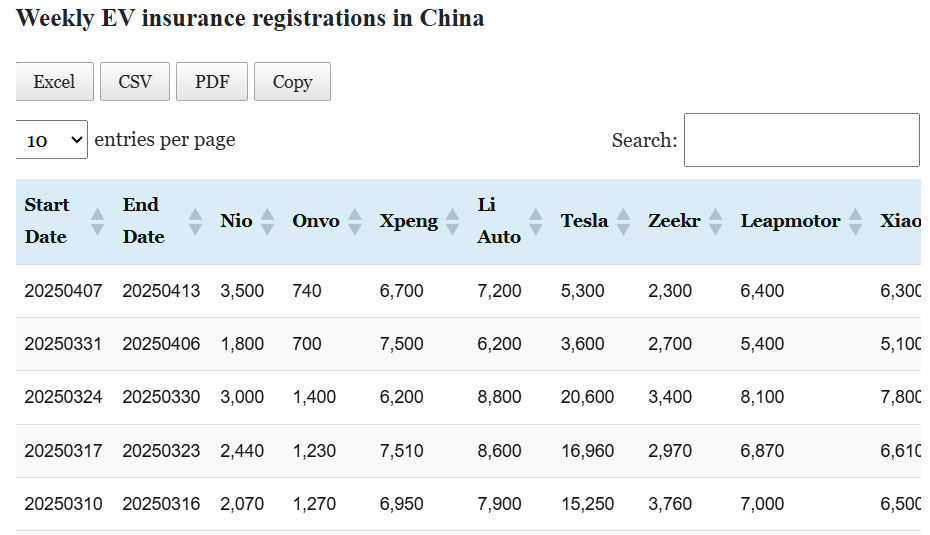 Weekly insurance registrations for vehicles of Nio, Xpeng, Li Auto, Tesla, Zeekr, and Leapmotor are included in this article.