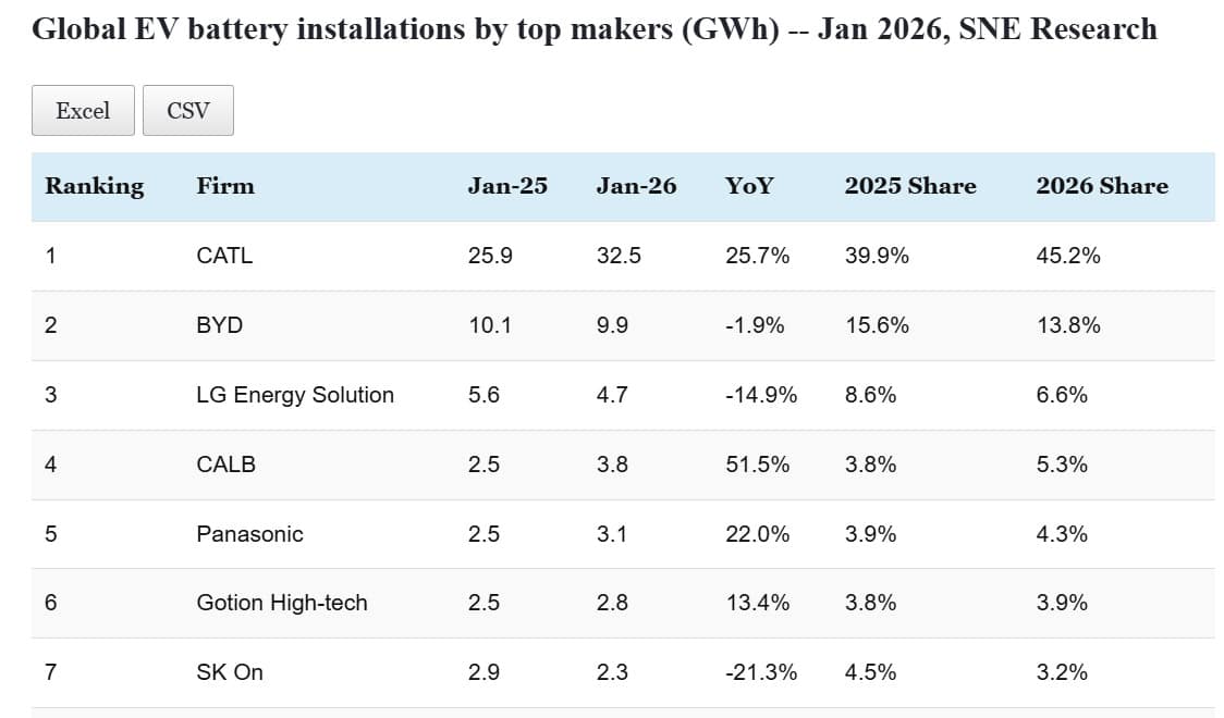 Data table: Top EV battery makers' global installations in Jan 2026