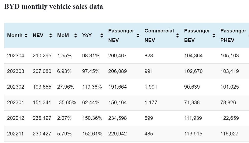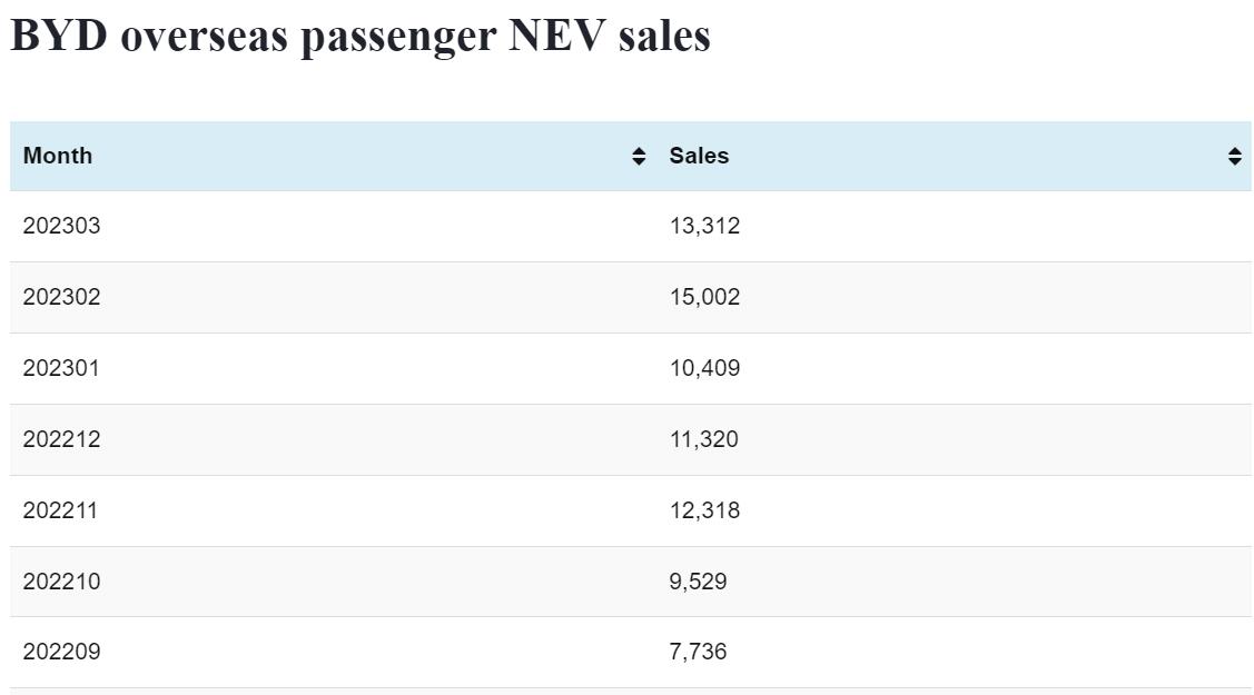 In March, BYD sold 13,312 NEVs in overseas markets, down 11.27 percent from 15,002 units in February.