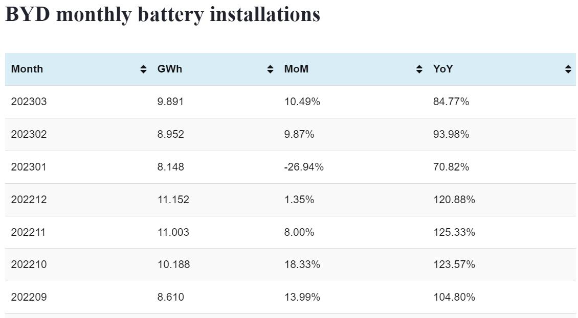 BYD's installed power and energy storage battery capacity in March was 9.891 GWh, up 84.77 percent from the same month last year.