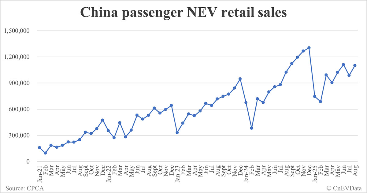 BEVs recorded retail sales of 826,000 units in September, marking a 28.5 percent year-on-year increase and a 19.8 percent rise from August.