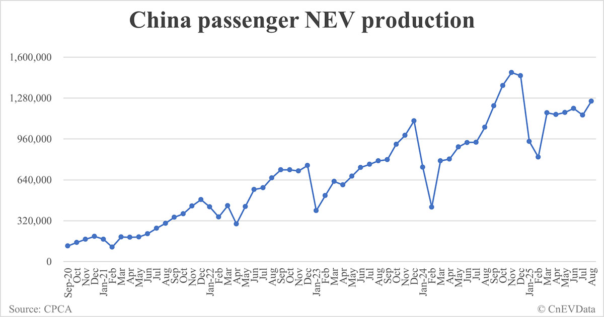 From January to August, China's passenger NEV production reached 8.85 million units, marking a 33.5 percent year-on-year increase.