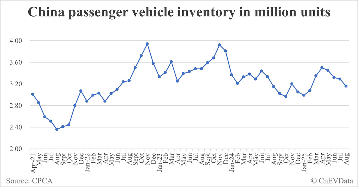 For manufacturers producing only NEVs, inventory stood at 780,000 units at end-July, down from 800,000 units at end-June.
