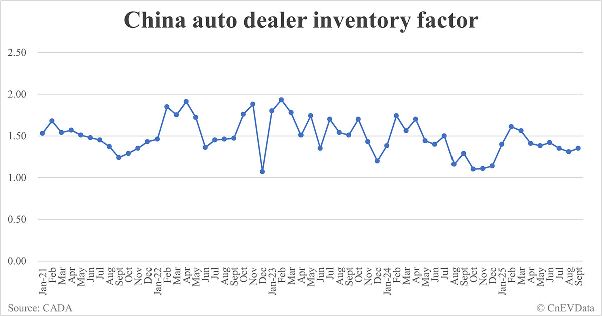 China's auto dealer inventory factor stood at 1.35 in September, below the 1.50 alert line but above the reasonable range.