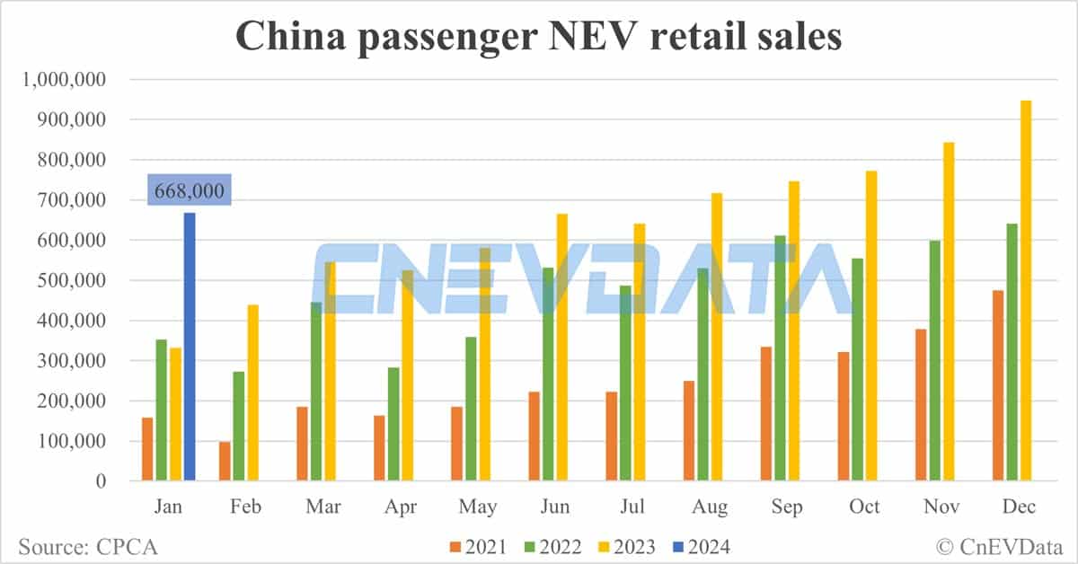 China Jan NEV retail data by CPCA: 668,000