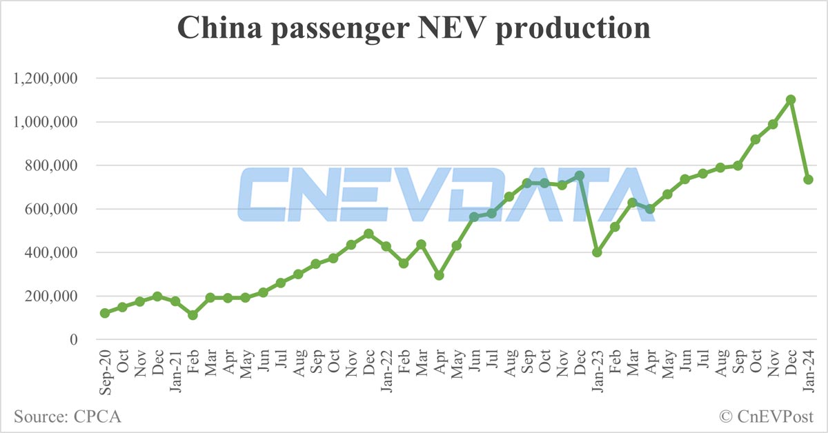China Jan NEV production data by CPCA: 734,000