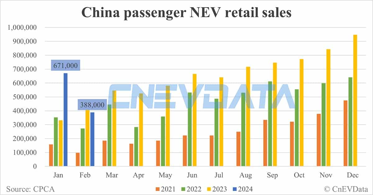 China Feb NEV retail data by CPCA: 388,000