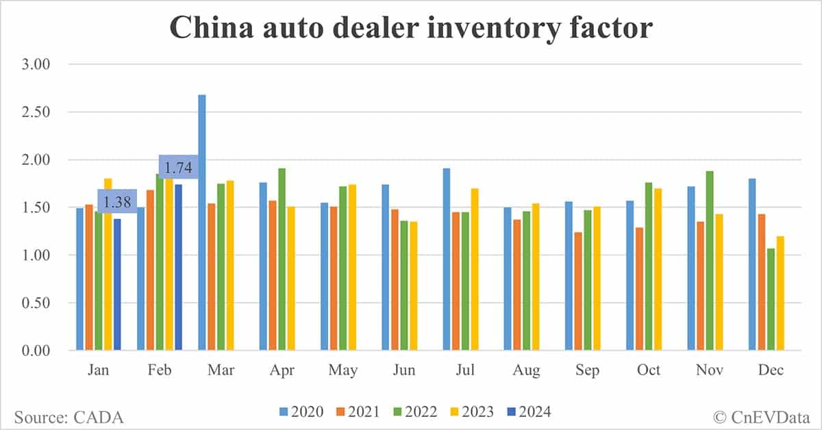 China automobile dealers' inventory factor stood at 1.74 in February, the first time since November 2023 that it was back above the 1.50 alert line.