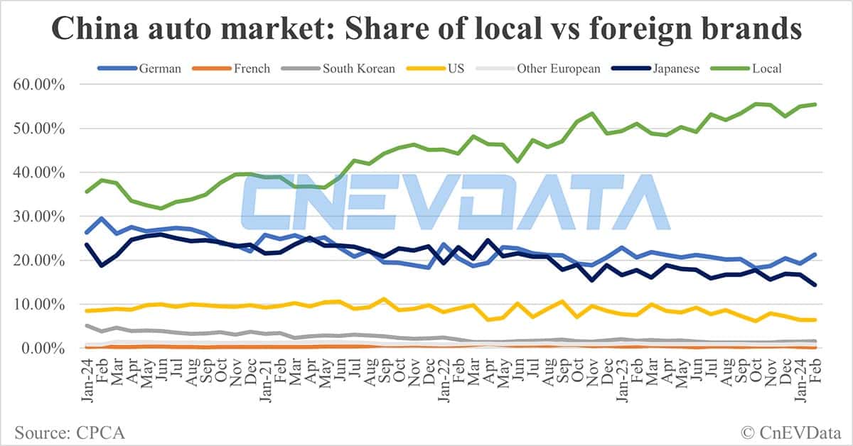 German brands came in second with a 21.26 percent share in February, while Japanese brands came in third with a 14.37 percent share.