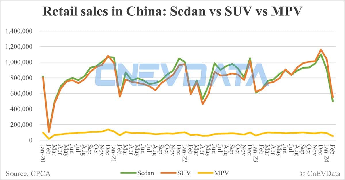 Retail sales of sedans in February were 499,699 units, SUVs 550,984 units and MPVs 52,811 units.