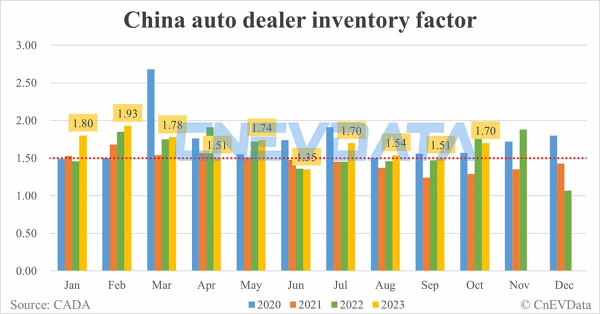 China auto dealer inventory factor at 1.70 in Oct, remains above alert line
