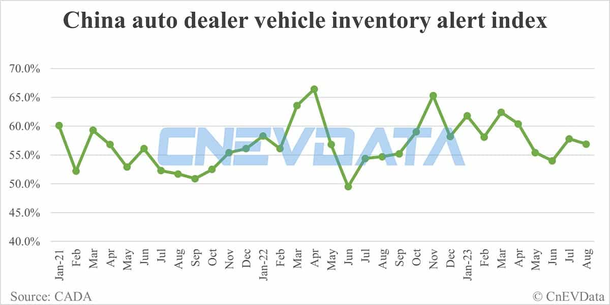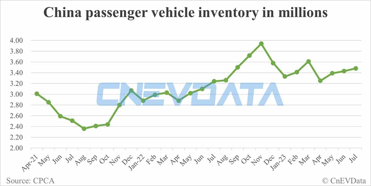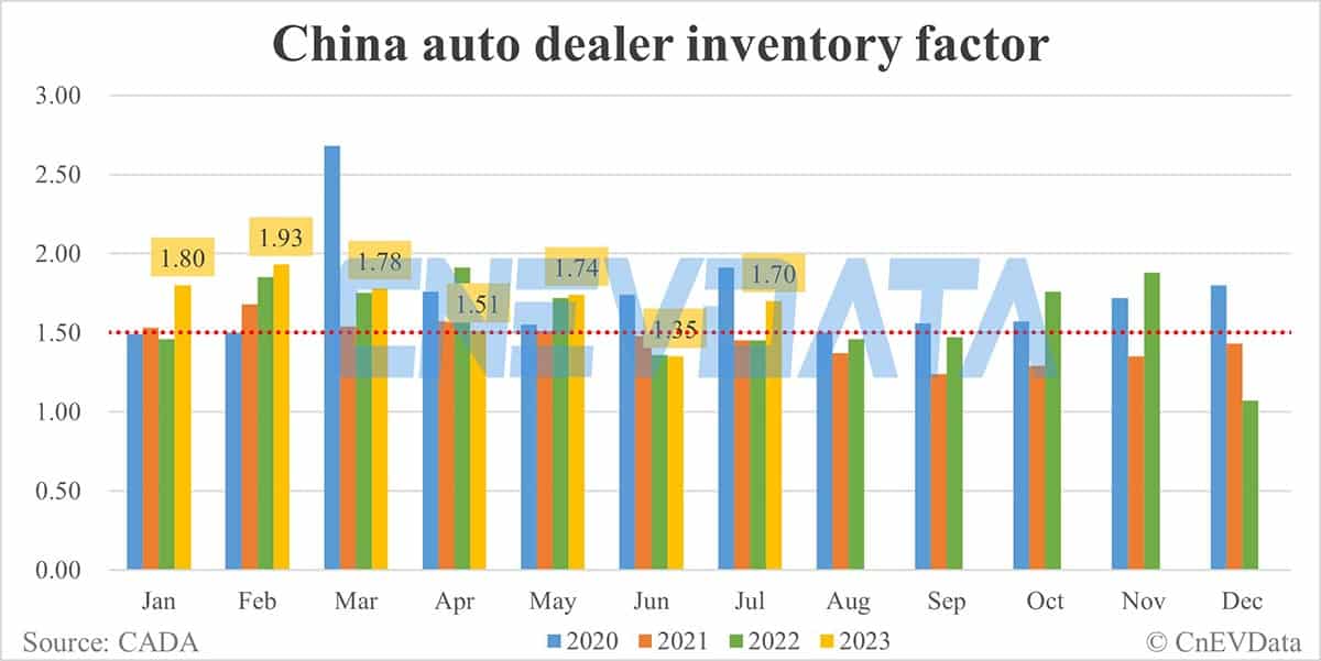 China's auto dealer inventory coefficient stood at 1.70 in July, back above the 1.5 alert line.