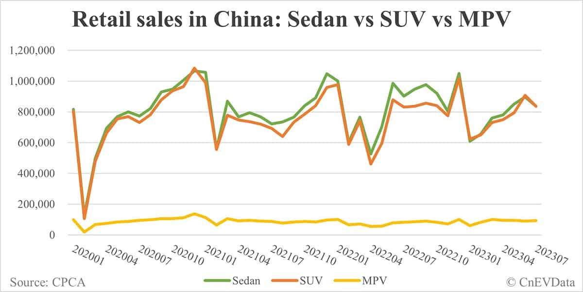 China Jul auto sales breakdown: Sedans 47.35%, SUVs 47.37%, MPVs 5.28%