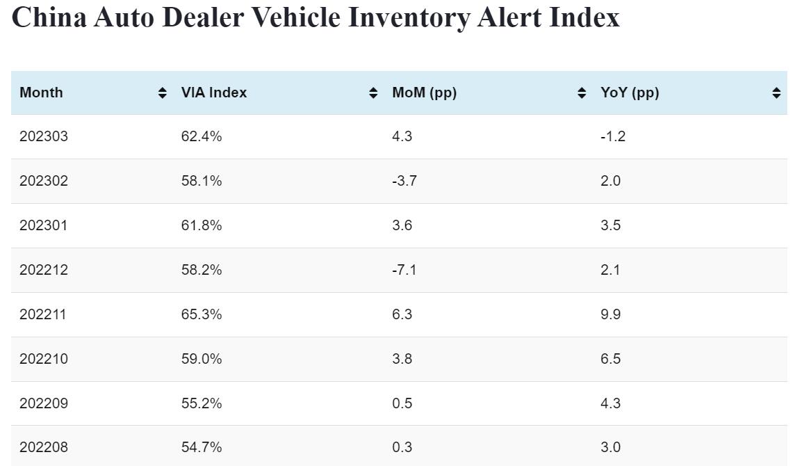 China Mar vehicle inventory alert index: 62.4%