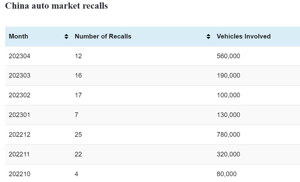 China auto market sees 12 recalls in Apr