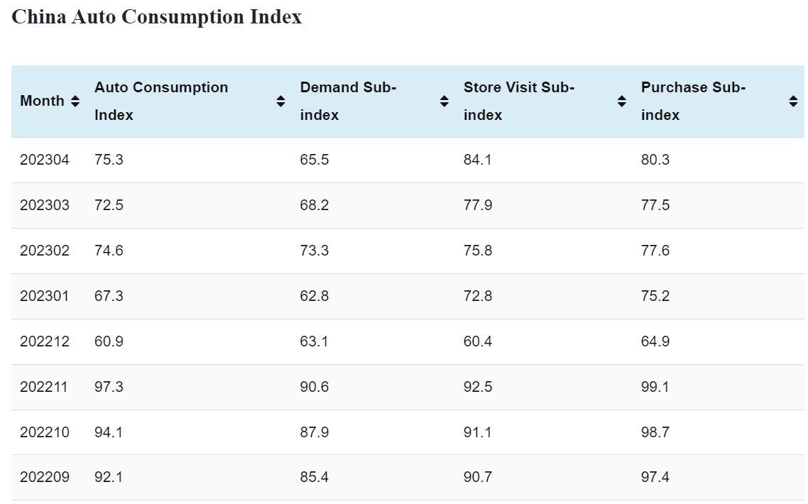 China auto consumption index in Apr: 75.3