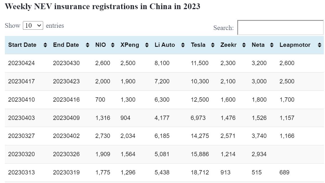 NIO was 2,600 for the week of April 24 to April 30, XPeng was 2,500, Li Auto was 8,100 and Tesla was 11,500.